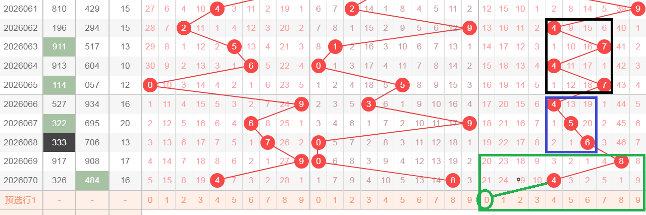 这是一张个位走势分析图,用文字不太好表达,还是直接看上面的视频,黑颜色4747是平行四边形,紧接着开出蓝颜色456顺子线条,那么轮到今天,绿颜色会开出线条还是等腰三角形