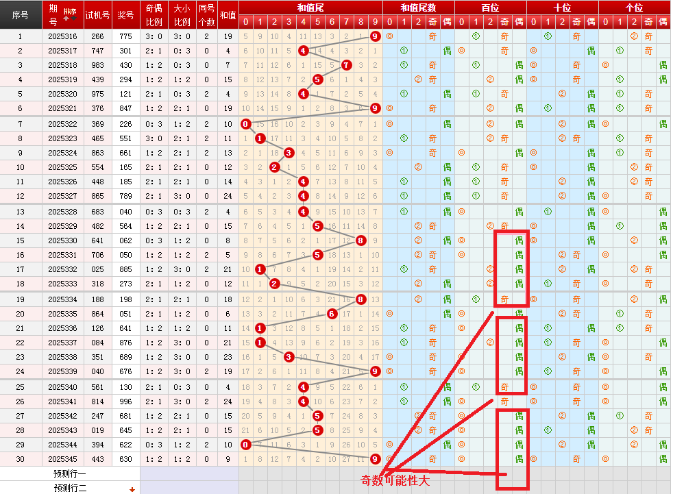 近30期和值奇共开出16期,和值偶共开出14期,和值奇数量稍多。近五期分别开出2奇1奇1奇0奇1奇,奇数弱势。观察各位置奇偶分布情况,上期开出和值奇,本期和值奇偶都有可能。