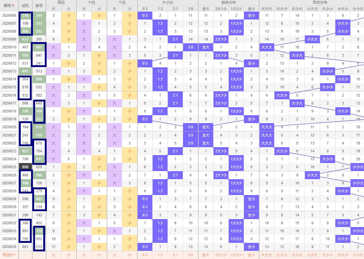大小走势分析 - 大小比:035期开奖号码213呈现小小小形态,综合近期大小号的波动趋势,建议本期重点关注大小比2:1的组合。