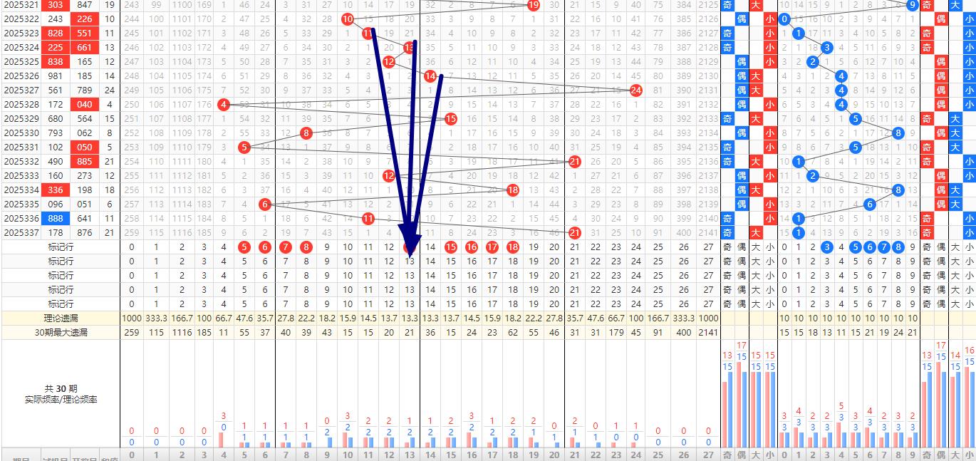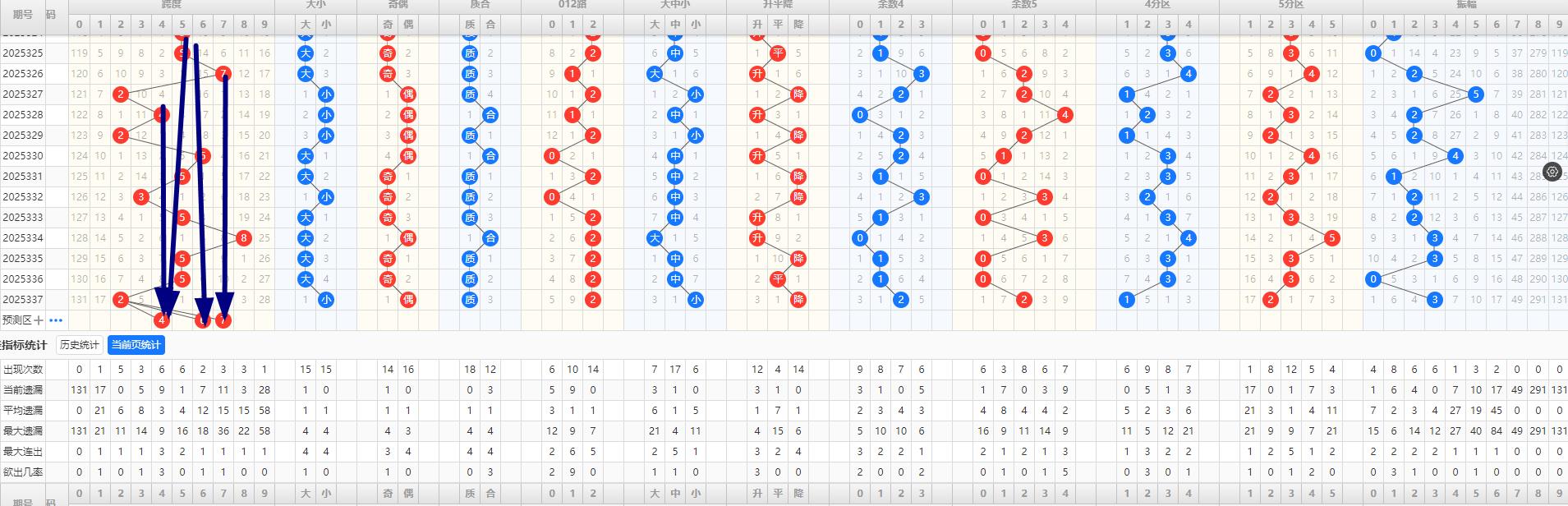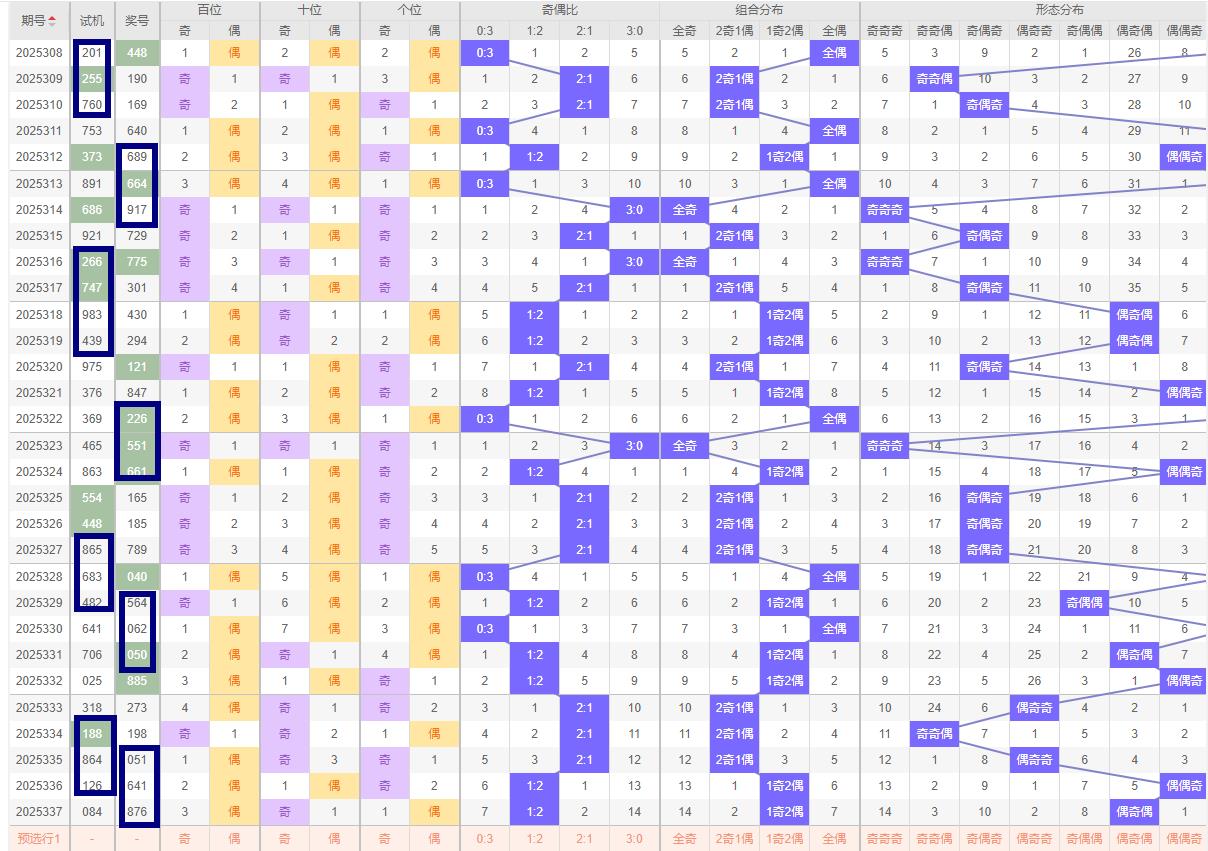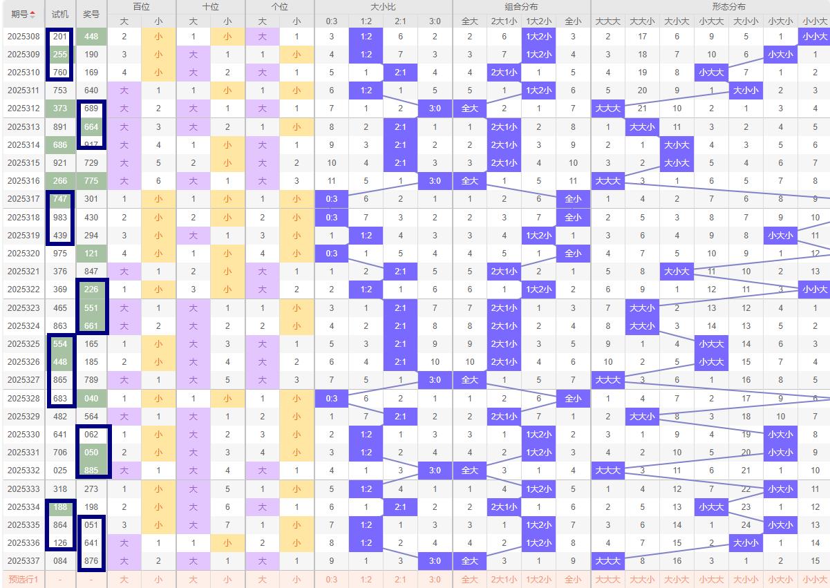 大小走向分析 根据337期开奖号码876,可以看到大小形态为大大大。在最近的走势中,大小号码开出比例基本持平。因此,对于338期,可以预判大小号码继续维持均衡状态,关注大小比1:2的组合。近十期大小比为15:15防两小一大.