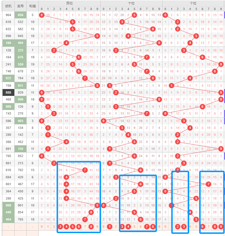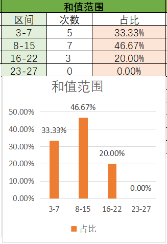 上期和值是18,处在16~22之间,其中16~22占比变大,8~15占比变小。目前是8~15占比最优,其次是3~7,最后是16~22。本期看好和值在8~15之间,其次是16~22。