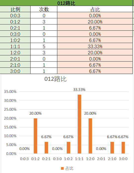 上期012路比是1:1:1,各个类型占比没有变化。近15期内1:1:1是开出最多的,其次是1:2:0,0:1:2,最后是3:0:0,2:1:0,0:2:1,1:0:2。总的看2路最热门,其次是1路,最后是0路,本期看好1:1:1和1:2:0。