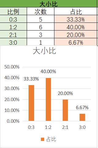 上期大小比为3:0,其中3:0占比变大,1:2占比变小。可以看到近15期内1:2优势最好的,其次是0:3,然后是2:1,最后是3:0。本期看好2:1开出,其次是1:2。