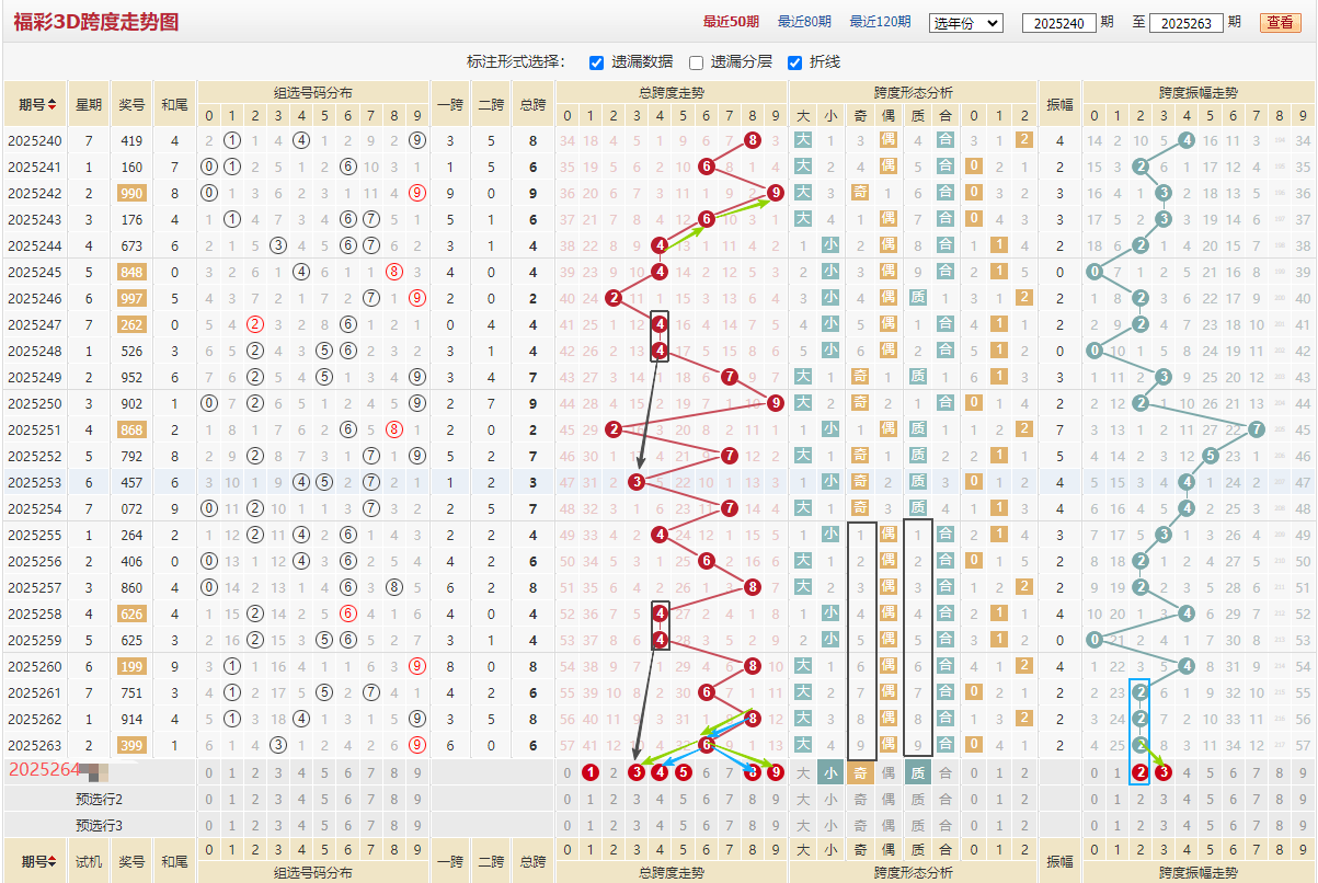 上期开出合跨6跨,近期跨度开出468 448 686,9期没开出奇数跨质数跨,从振幅角度看2振幅连续出4期也有过,本期还需关注对应4和8跨度,近期需要重点关注12357跨度,要从质数 奇数角度重点考虑,247期248期4跨度隔4期开个3跨,258期259期隔4期刚好一样形态,这个3跨大有概率开出, 264期推荐跨度:348951