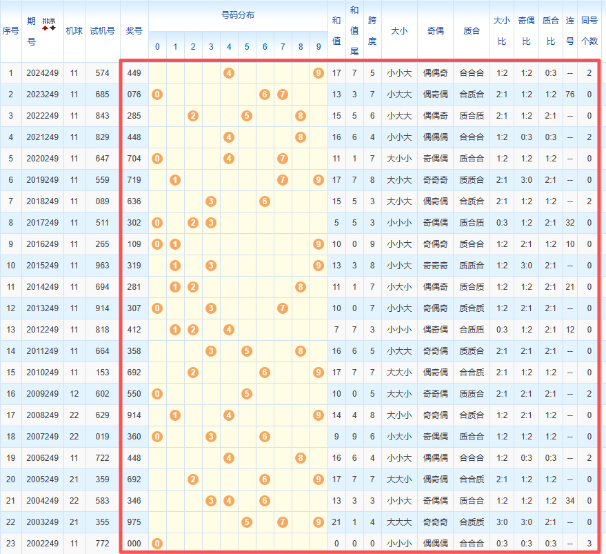 这23期大小比1:2出靠前,这期可以考虑选1:2。奇偶2:1出靠前,奇偶比可以考虑2:1