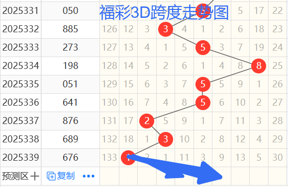2)我们来看跨度;还是以335期——339期为例,如图依次是55231跨度,按照路数转换关系来看,那么跨度我们暂定147369跨 ,本期个人比较看好4 6跨。