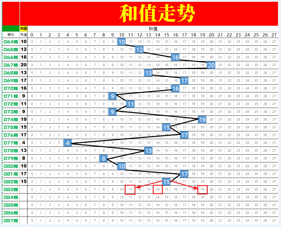 本期和值仅画出三个,分别是11、14、19,近几期奇数和值比较热,本来想多考虑偶数和值的,但是看了一圈没有特别有把握的,所以添加了一个和值14作为参考。现在看来,和值也只能是当我们参考的工具之一,不能看的太重要,因为正确的答案就一个,如果看错了满盘皆错。