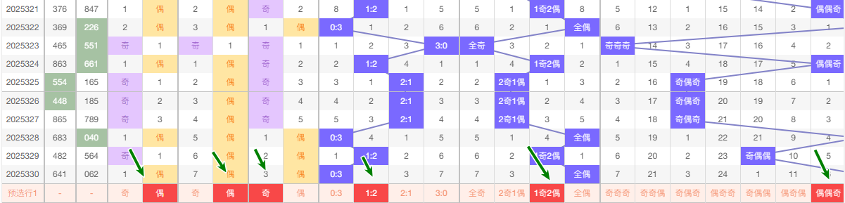 (二)、奇偶分析 奇数 13579 偶数 02468 在这5期 数据中 奇数出现5次 偶数出现 10次 从昨天出号来看偶数占优, 本期还是看好奇数有号 看好 偶偶奇 奇偶奇