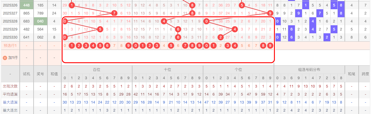 在最近的5期当中百位大数出现的频次2次 小数出现3次 ,从图上来看本期百位出号走小,大家注意防守配号
