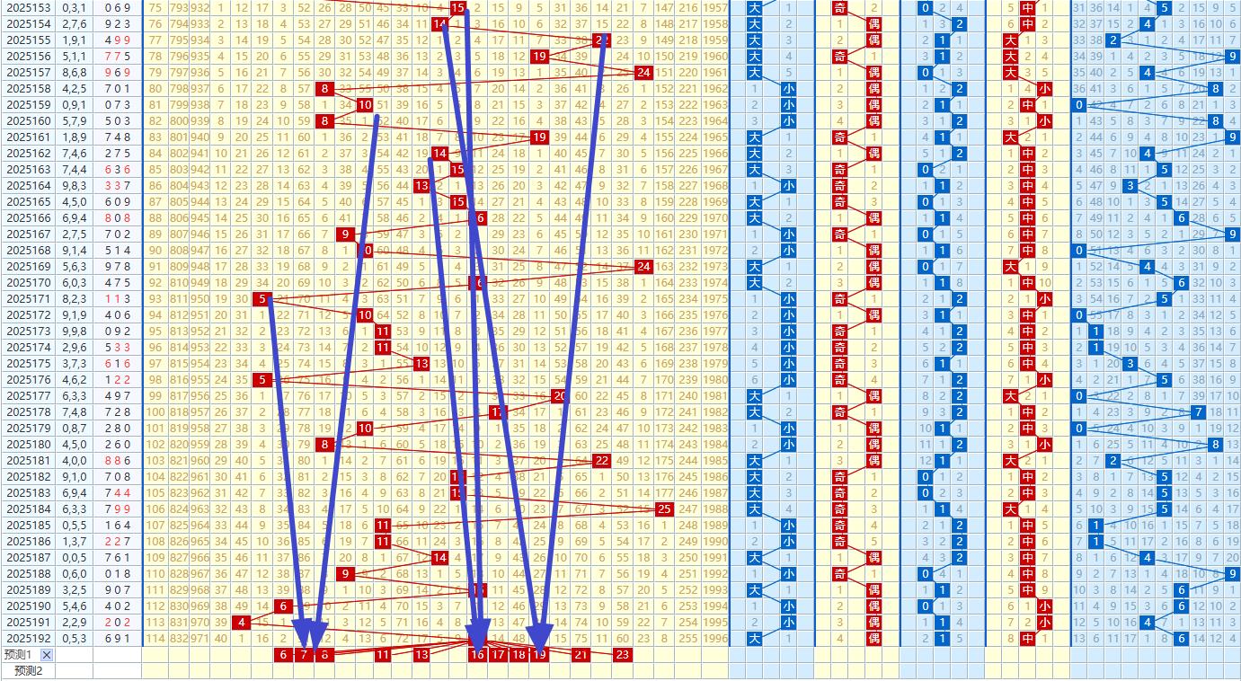 和值预判分析 : 近期走势:上一期(192期)的和值为16,处于中等较大水平。 考虑到历史数据和近期走势,本期和值将有可能走小,重点关注奇数的和值。