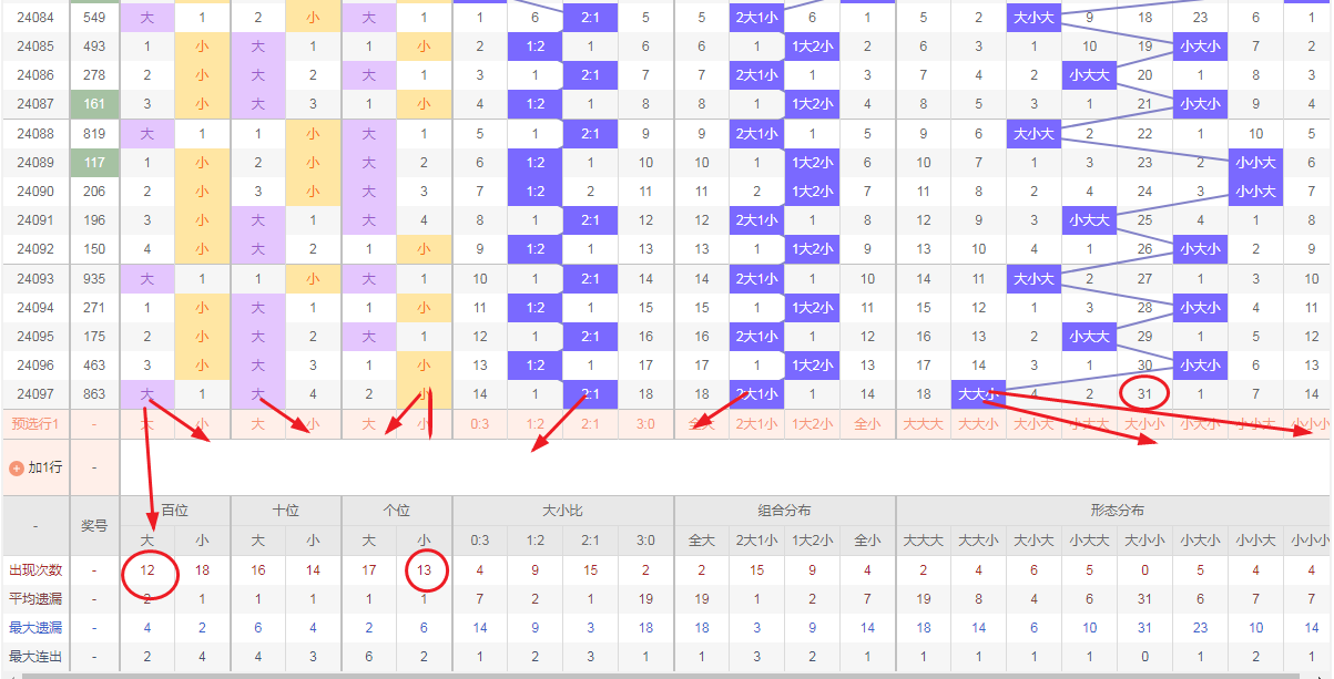 排列三 大小形态分析:从大小走势图上可以看出排列三100期内百位大小比为53比47,十位大小比为46:54,个位大小比为53比47除了十位偶数比奇数多,百位和十位都是奇数比偶数多。历史数据近3期开出大大小后下一期的走势为,第67期开出大大小第68期开小小大。第74期开出大大小后第75期开大大小,第90期开出大大小后第91期走小大小。可以看出开出大大小形态后形态转变过快,不过还是能看出开出大大小形态后下一期还是比较规律的进行切换,这时遗漏数据就显示作用的时候,结合遗漏数据再加上开出大大小形态后容易进行下一个类型变化。所以排列三第98期大小形态推荐小小防大小小。本文由一起彩作者钱是生命动力所著请勿抄袭