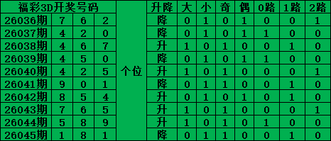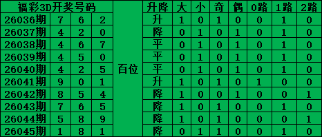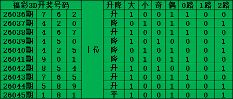 福彩3D是从0-9每期开出3个号码,截至2026045期三个位置最大遗漏的是38期的:百位的3号。