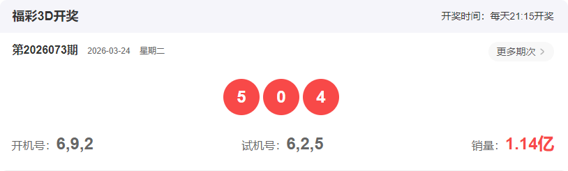 各位一起彩的朋友,大家好、我是福星研彩现在我们来回顾一下上期福彩3D,2026073期福彩3D开出奖号504,属性为组六。