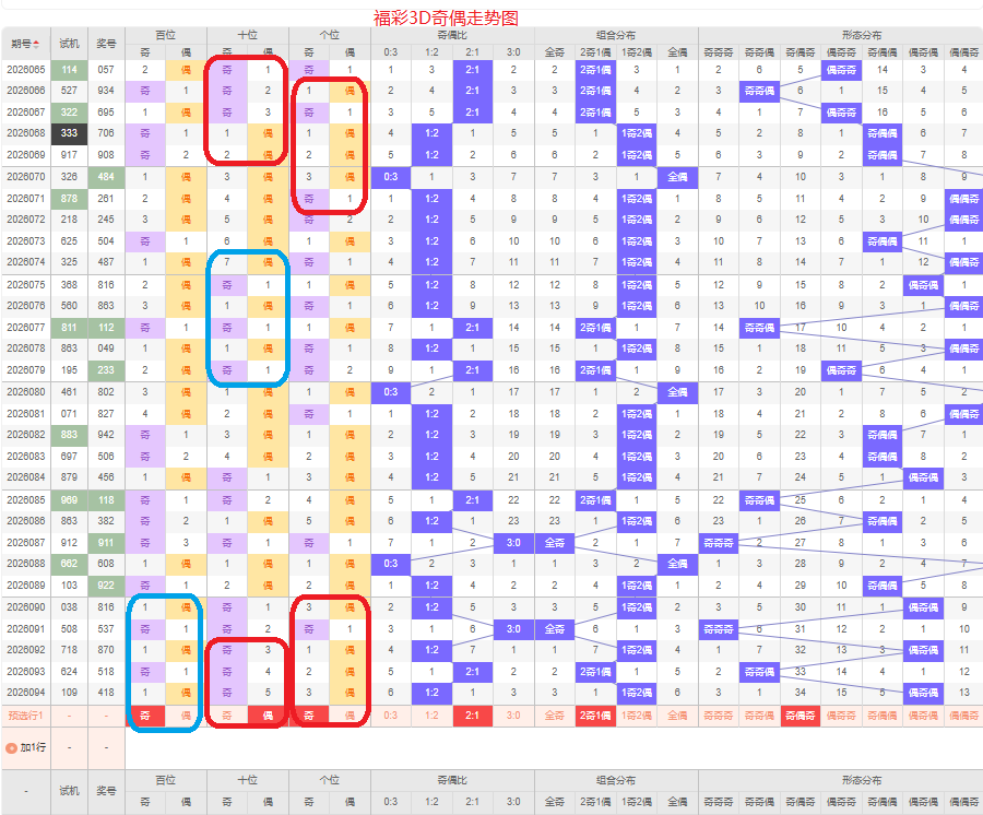 上期奇偶比是1:2,两偶的号码组合方式,从近五期的奇偶数出现情况看,奇数出现8次,偶数出现7次,奇数偶数号码出现较平均,本期侧重两奇的号码组合,侧重奇偶奇或奇偶偶的号码组合方式,根据奇偶形态做五码定位13579/02468/13579或13579/02468/02468