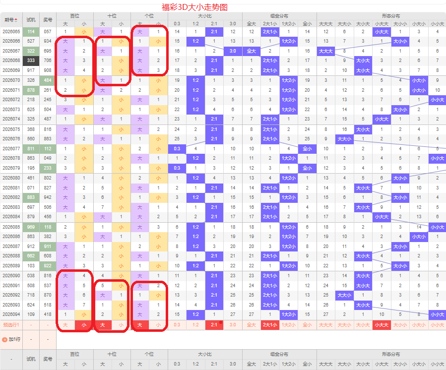 上期大小比为1:2,两小的号码组合方式,从近五期出现情况看,大号码出现9次,小号码出现6次,大号码出现较多,本期侧重两大的号码组合,本期百位侧重小号码,十位侧重大号码,个位要侧重看大,侧重小大大或者小小大的号码组合,根据大小做五码定位01234/56789/56789或01234/01234/56789
