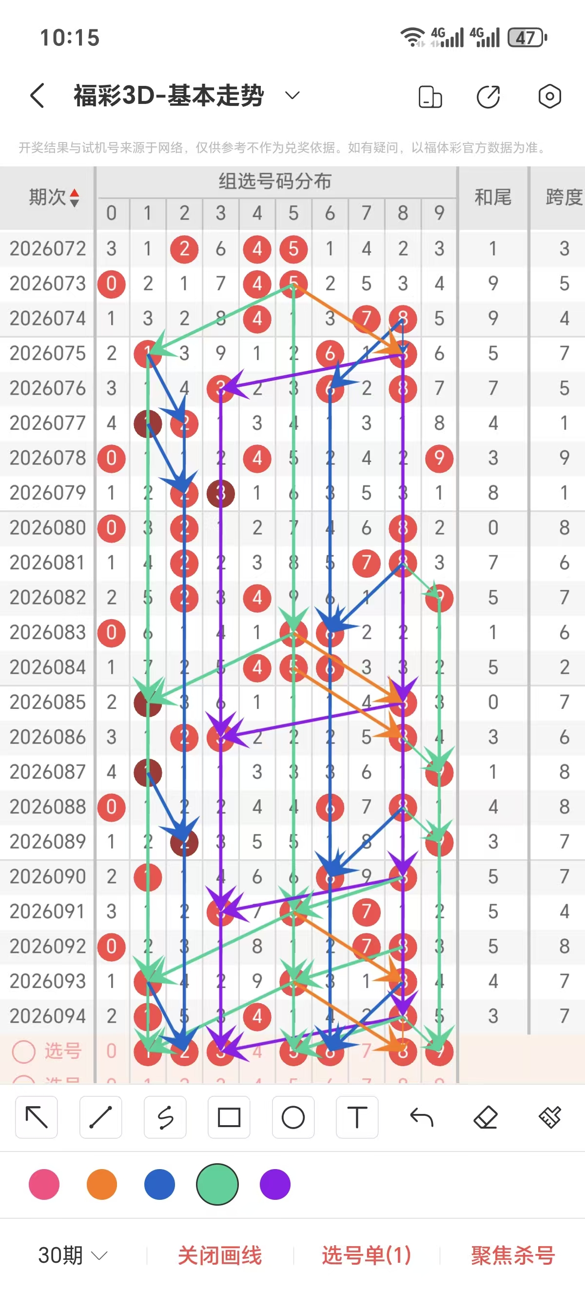 跨度通常情况下在五期之内重复一个跨度的概率很高,近五期重复了7的跨度,近五期跨度为7/4/8/7/7,近期12路的跨度较热,上期是1路的跨度,本期要侧重跨度以3/4/5跨为主的号码组合。可以从跨度方面选择相应的双胆码组合,双胆码的选取要根据近期和历史的走势进一步的分析选取。