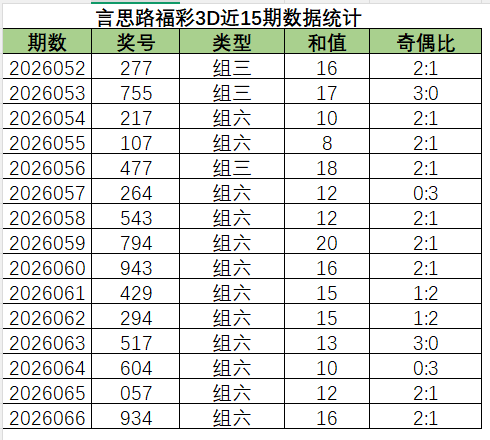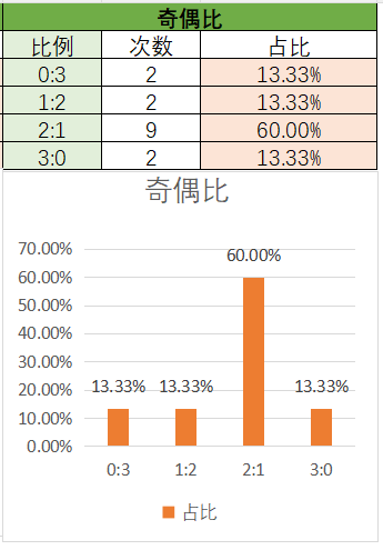 上期奇偶比为2:1,其中2:1占比变大,1:2占比变小。近15期内2:1优势最好,然后是1:2,3:0,0:3。上期开了2:1奇偶比,本期看好1:2奇偶比的开出,其次是2:1。