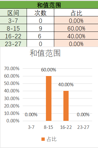 上期和值是16,处在16~22之间,其中16~22占比变大,3~7占比变小。目前是8~15占比最优,其次是16~22。本期看好和值在8~15之间,其次是16~22。