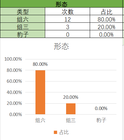 上期开的是组六,各个类型占比没有变化。通过图示可以看到,组六在15期内开了12期,组三开了3期。本期关注组六,防组三。