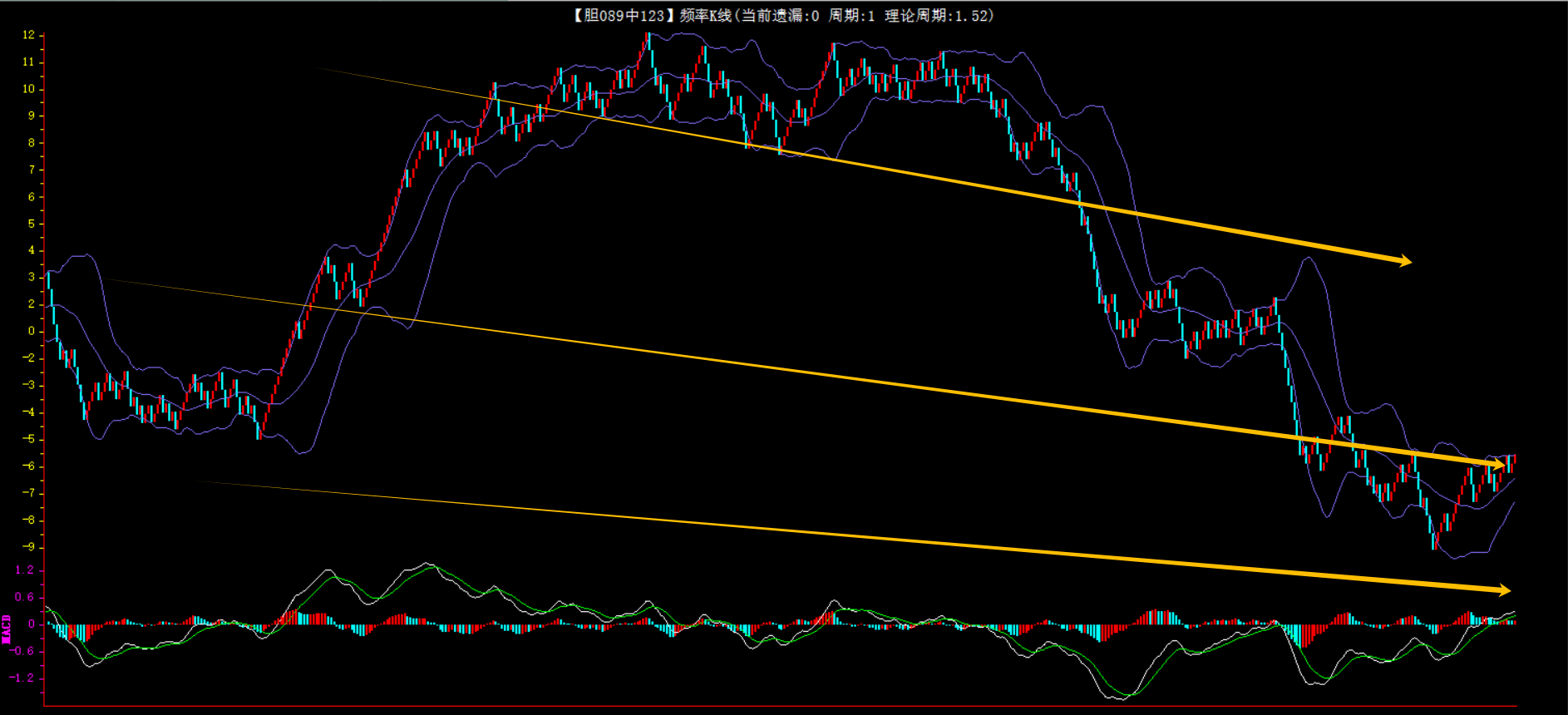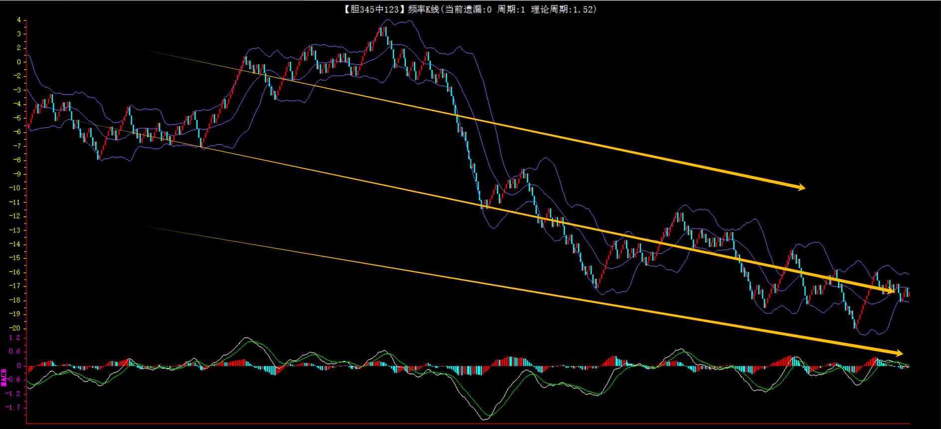 整体趋势下行,上边沿线趋势向下,下边沿趋势也是向下,节点震荡,当前连开2期,本期防守。