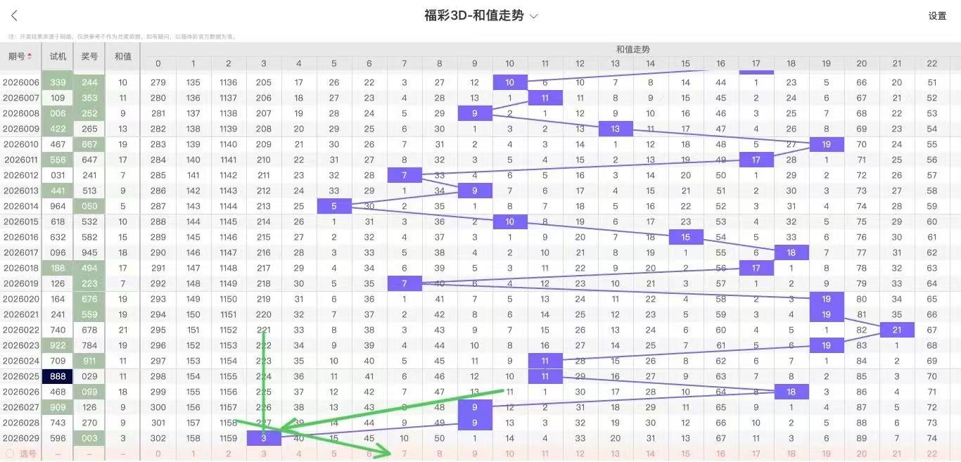 2026030期福彩3D和值走势图如下:上期开出和值3,和值在第1分区,而近百期开出和值3共1次,下期数据:-----  根据和值3的下期钟摆走势来看升趋势稳定,近期和值喜在第2分区活动,和值形态规律:奇:大和尾形态奇:大,那么本期重点推荐值范围是:9-19主奇形态