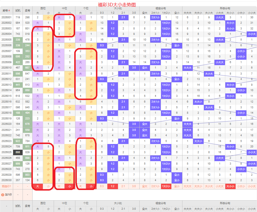 百位近六期是小号码,侧重大号码,侧重奇数的号码,侧重1路和2路的号码,侧重号码23458。