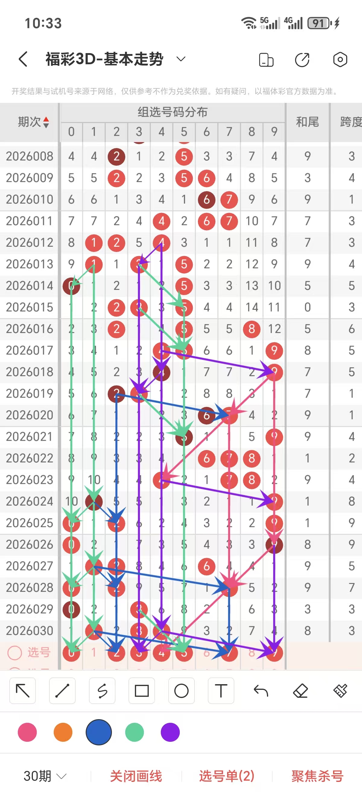 跨度通常情况下在五期之内重复一个跨度的概率很高,近五期重复了3的跨度,近五期跨度为9/5/7/3/3,近期0路的跨度较热,上期是0路的跨度,本期要侧重跨度以3/5/6跨为主的号码组合。可以从跨度方面选择相应的双胆码组合,双胆码的选取要根据近期和历史的走势进一步的分析选取。