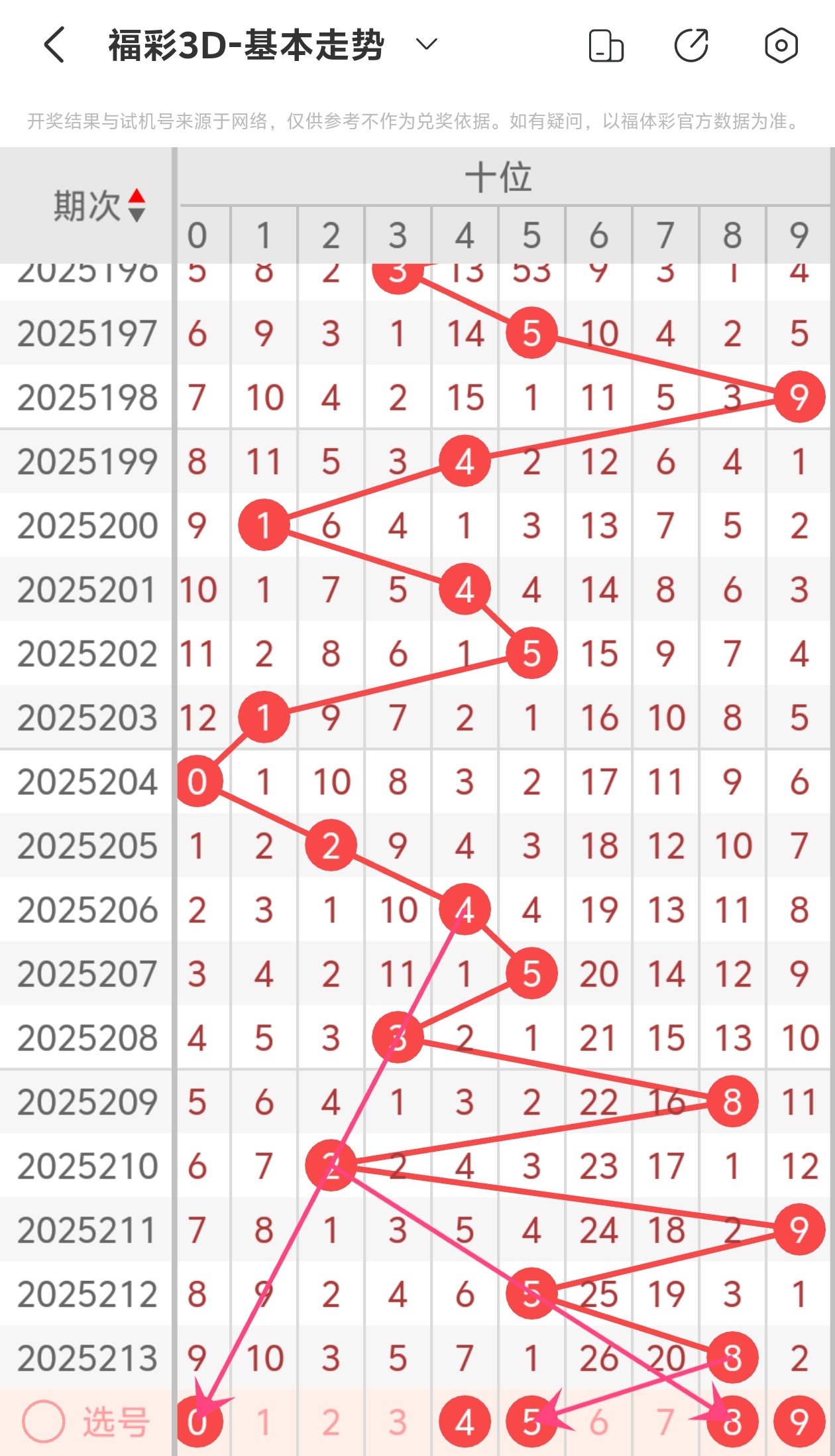 上期十位开出2,本区与上期的跨度为2,本期我们可以从上面走势图中看出选号的思路,0为斜连走势跨度为八,5为隔期回补走势跨度为三,8为重码,9为分边走势跨一,综合以上分析,本期十位推荐:04589
