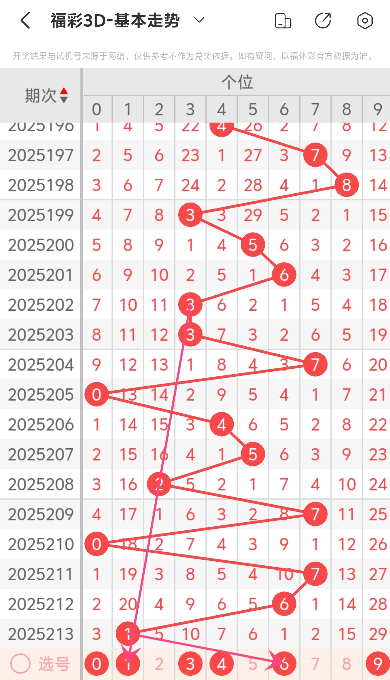 上期个位开出0,本区与上期的跨度为7,本期我们可以从上面走势图中看出选号的思路,1为重码带斜连走势,6为隔期回补走势跨度为五,综合以上分析,本期个位推荐:01346