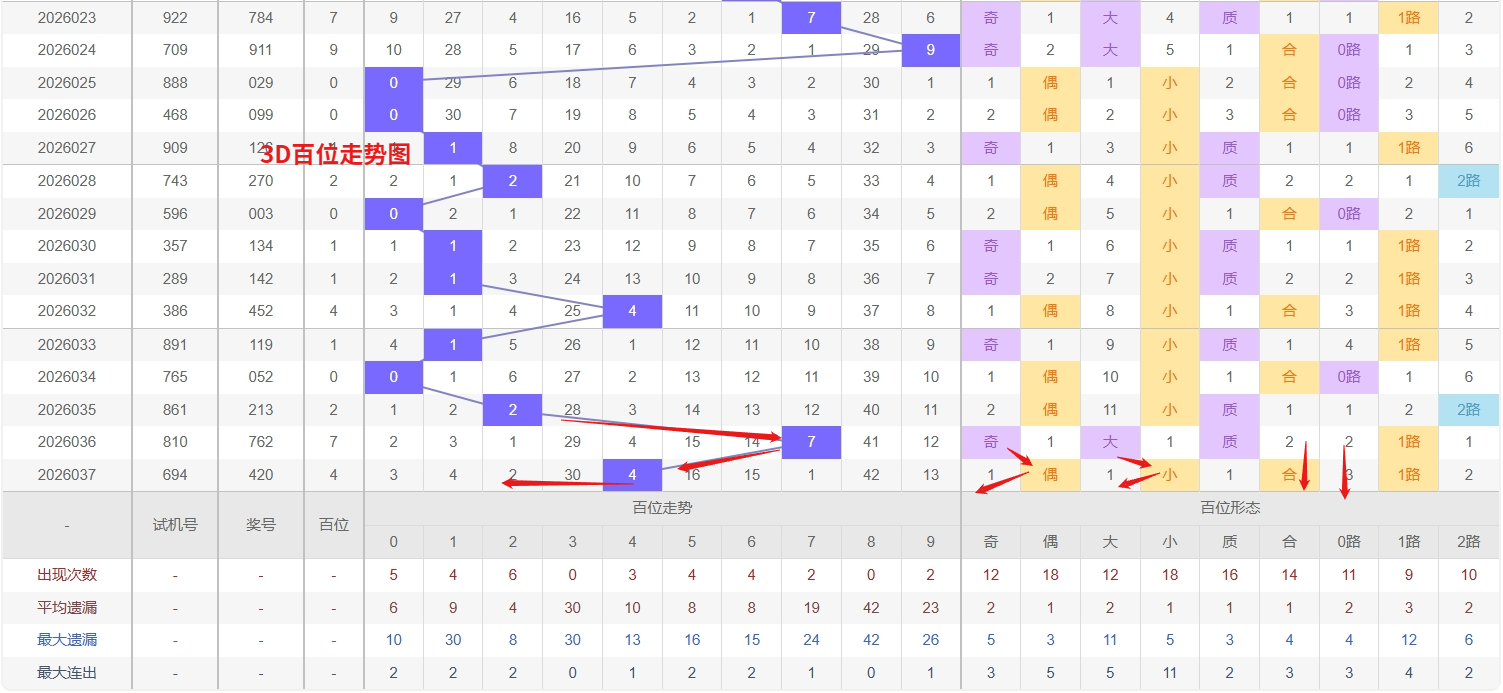 福彩3D百位分析:第2026037期百位开出号码4属于小偶数,从上面百位走势图上可以看出近100期大小比约为54:46奇偶比约为53:47。近期数据还是比较极端的符合文章开头介绍的求均衡规律非等量现象。但这种均衡不会持续最终会被偏态运行打破,然后循环往复。但短期内大小相差3点,大数过热小数有回补需求本期个人认为走小数的概率更高。上期百位落号“4”号球,在百位号码开出1路号码4后向小数方向走出3个振幅。那么通过分析上期百位落位号码分析,号码走出3个振幅,号码走为小偶数,开出1路号码4。通过对百位落号趋势来分析,百位号码落位前端,通过对近10期的走势来看百位号码大小交替频繁走2期大数又走3小数,近期3D百位走势分析,号码3和8已形成明显的冷态格局,其遗漏值均处于相对高位,从概率均衡的角度来看,冷号在经历长期沉寂后往往具备较强的技术性回补需求,尤其是在百位整体走势进入调整或轮动阶段时,这类冷号需要重点关注其可能的解冻信号。与此同时,号码2近期表现活跃,呈现连续或高频出现的强势热态,热号在未出现明确转折前往往具有一定的延续惯性,因此短期内仍需重点防范其再次开出。我们在百位关注的重点在12368这5个号码球上,百位号码近期奇偶切换频繁,4号球码属于1路号码偶数,现偶数开出过多有继续向偶数的趋势。所以福彩3D第2026038期百位看12368。本文由一起彩钱是生命动力所著,请勿转载