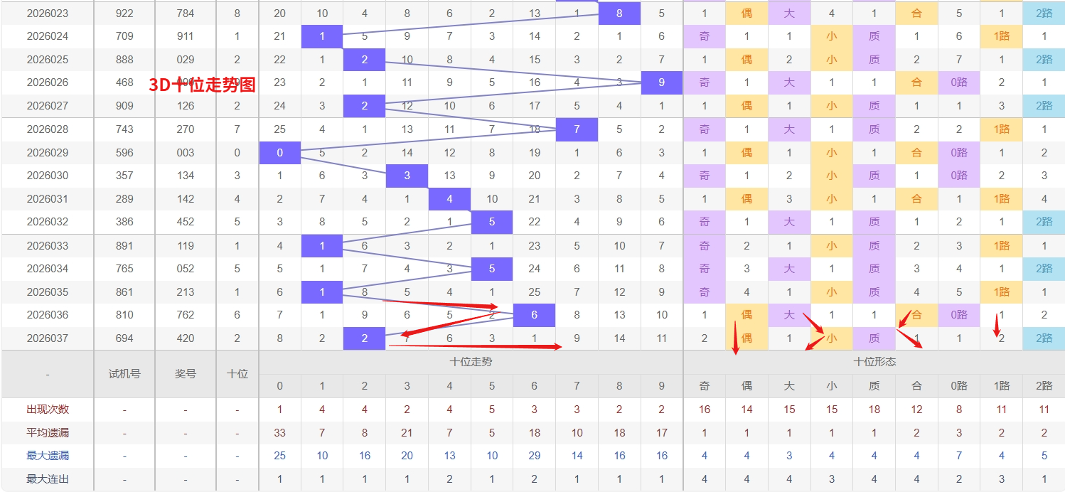 福彩3D十位分析:第2026037期十位开出号码2属小偶数号码前端。以历史100期数据为例十位奇偶比约为48比52,大小比约为54比46近期大小相差4点,根据求均衡的规律开出小数的概率比大数高一点。上期我们分析奇数经过连续回补后有走偶数的可能,开出奖号2小偶数符合我们的预期。近期3D十位走势分析,号码4和5呈现明显的热态特征,两者交替或连续出现的频率较高,显示出较强的持续性与活跃度。历史数据表明,热号在未出现明显拐点前,往往具备一定的惯性延伸,短期内仍需将其作为重点防守对象,警惕其热度延续或间隔回补的可能。与此同时,号码9已进入相对较深的冷态区间,其遗漏值攀升至阶段性高位。所以福彩3D第2026038期十位推荐34579。本文由一起彩钱是生命动力所著,请勿转载