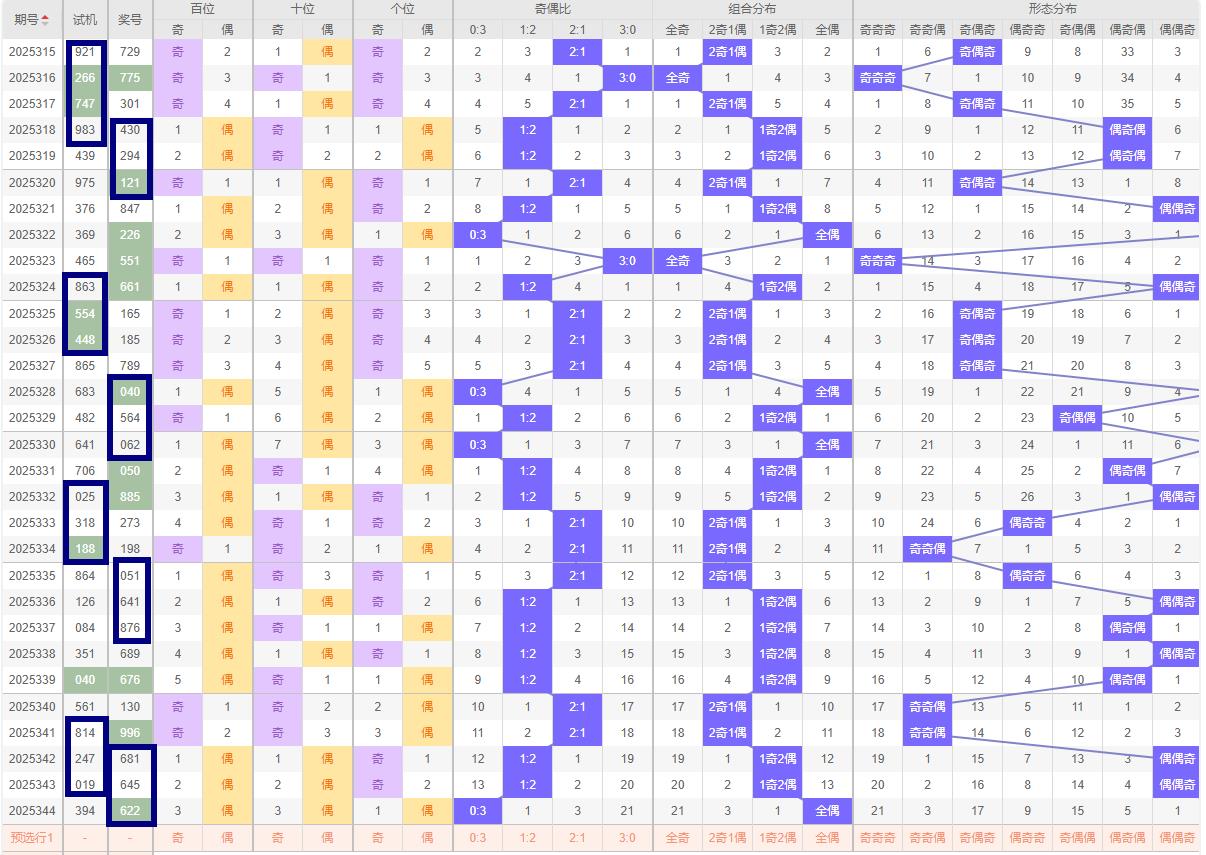 奇偶比例分析 - 奇偶比:344期号码为622偶偶偶形态,奇偶比例为0:3。结合历史数据与近期走势特征,本期可继续倾向于奇偶比为2:1的组合,即预测二位奇数搭配一位偶数。