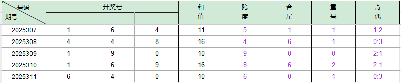 2025311期开奖号码640,我们可以看出近30期百位6出现3次,十位4出现4次,个位0出现3次。