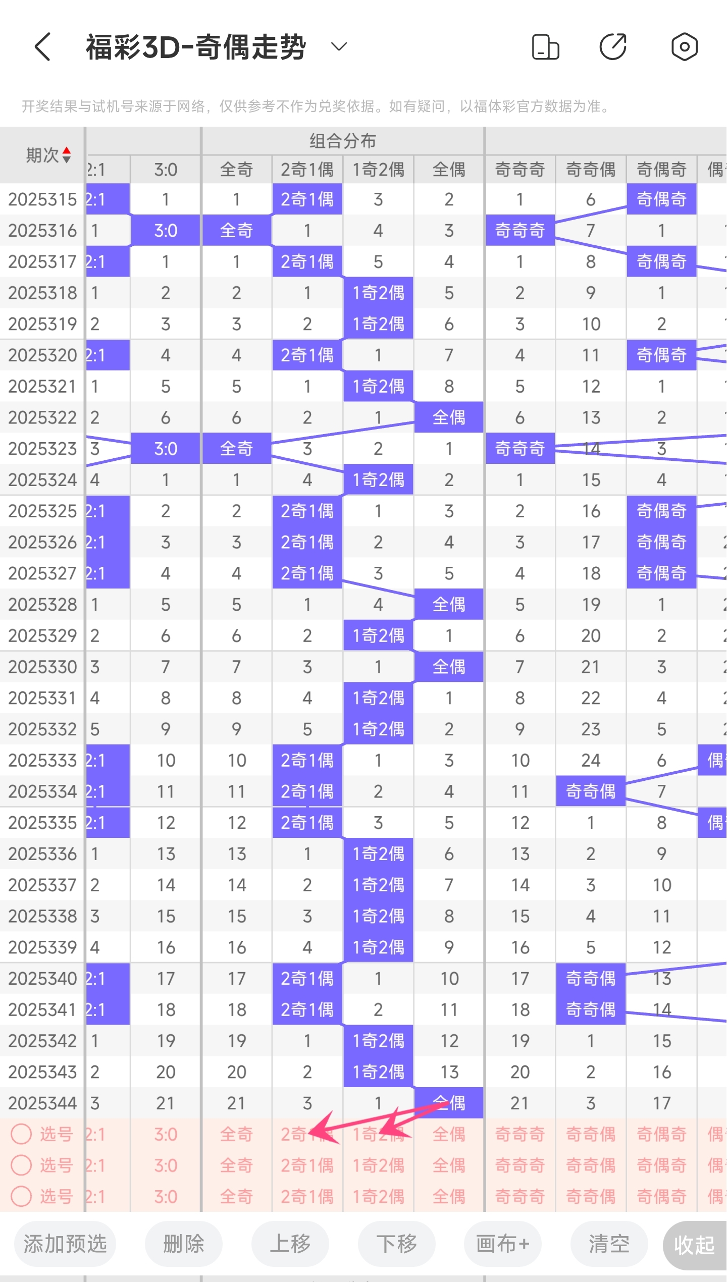 上期开了全偶的情况,往前一期开出的是1奇2偶。从组合数学理论上来讲,开出2奇1偶和1奇2偶的概率都为37.5%,开出全偶和全奇的概率为12.5%。通过分析目前30期内的数据。本期的开出全偶的概率是13.33%,开出全奇的概率为6.66%,开出1奇2偶的概率为43.33%,开出2奇1偶的概率是36.66%。和前一期相比,全偶概率变大,全奇概率变小。通过走势图可以看到,上期开全偶,一般都不会连出,所以本期看好1奇2偶。所以本期推测可能开1奇2偶,其次是2奇1偶,然后是全奇或者全偶类型。