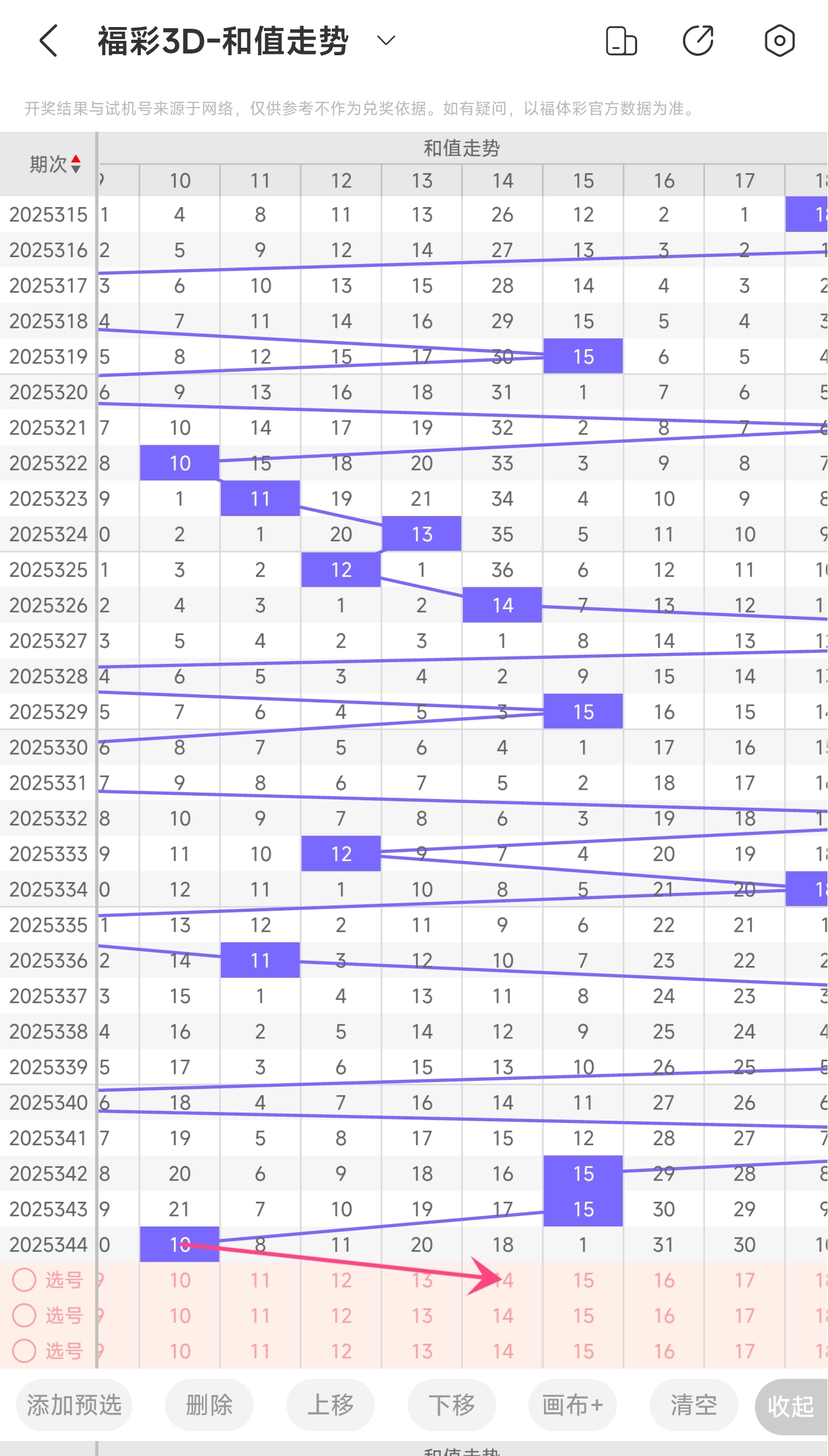 上期和值是10,往前一期和值是15。和值往左移动,偏移振幅为5。10和值也是处于近30期内开出的较小的和值。上升的空间比较大,下降的空间比较小,本期看好和值变大,所以本期趋势是大概率往右。因此推测本期和值趋势是大概率往右的,和值变大,小概率往左,和值变小。