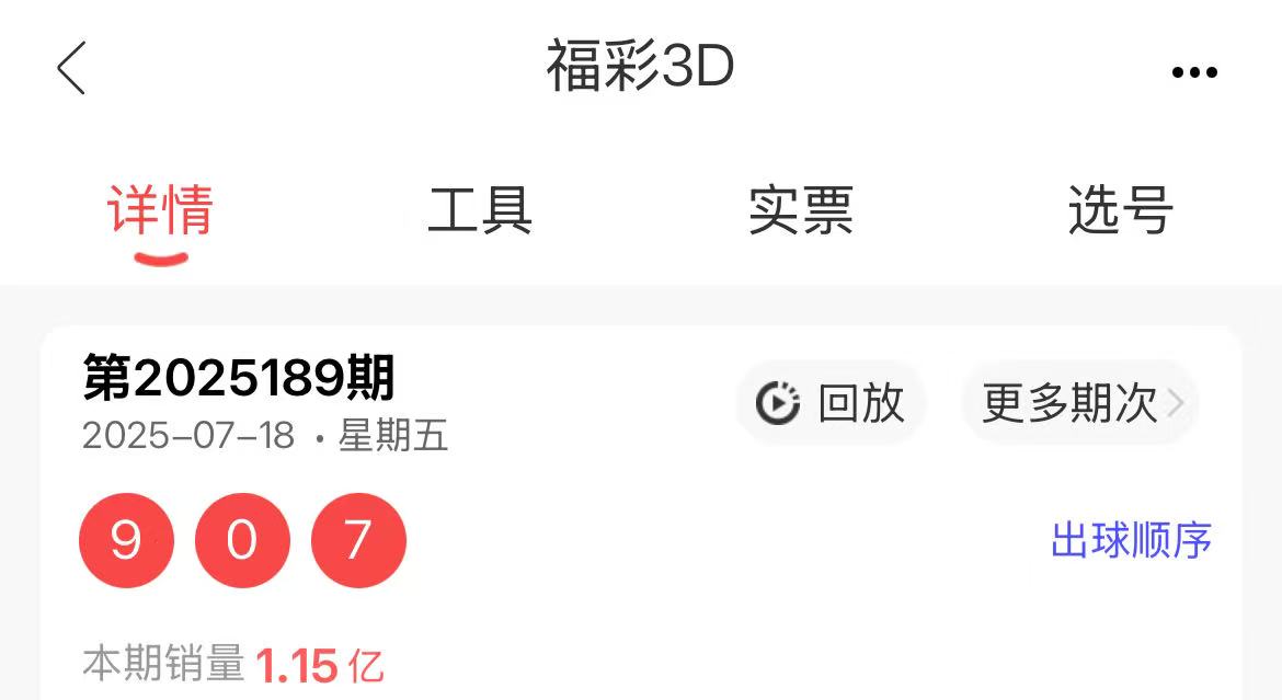 189期开奖号为907,形态组六,质合比1:2,和值16,跨度9,012路比为2:1:0,大小比2:1,奇偶比2:1