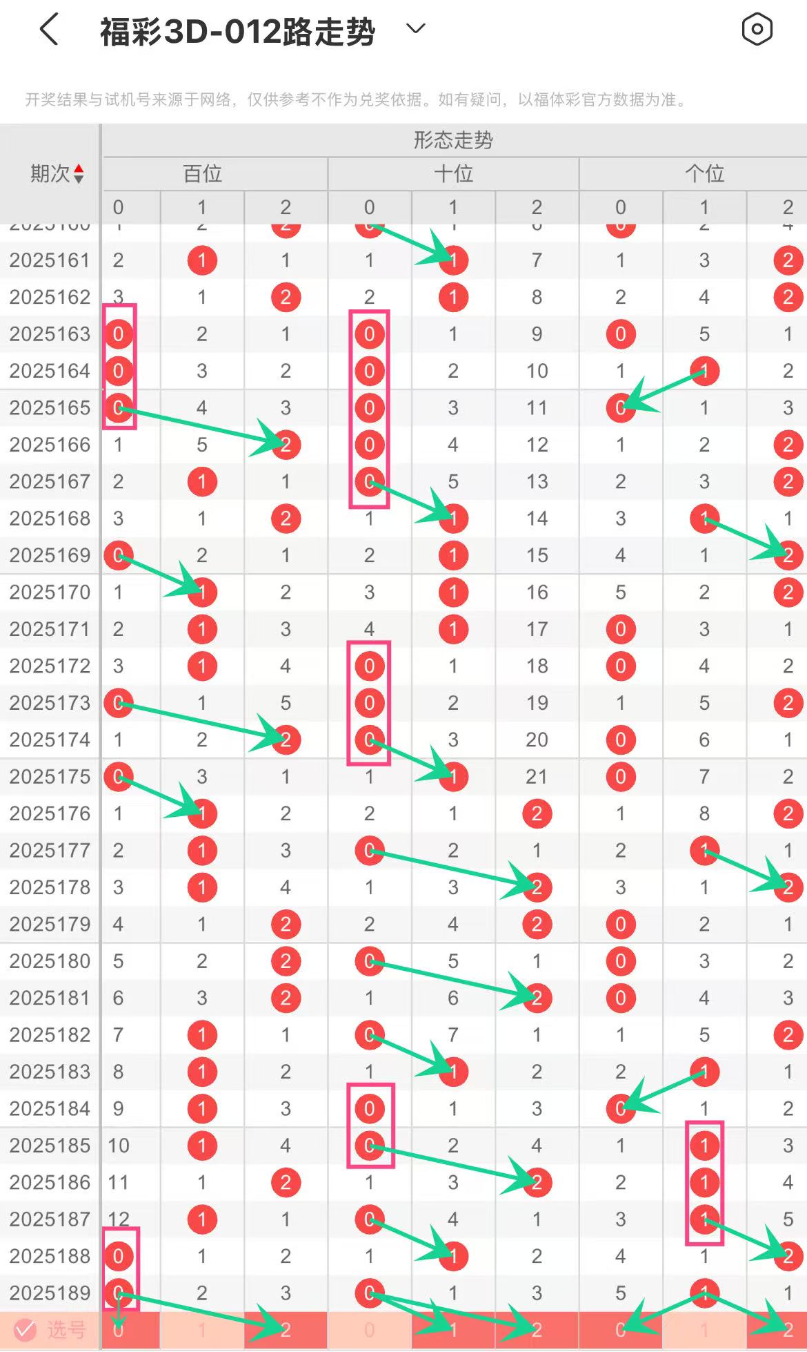 福彩3D中,012路是把0-9这10个数字按除3余数划分,0、3、6、9为0路,1、4、7为1路,2、5、8为2路。以下是对近30期百、十、个位012路形态走势分析