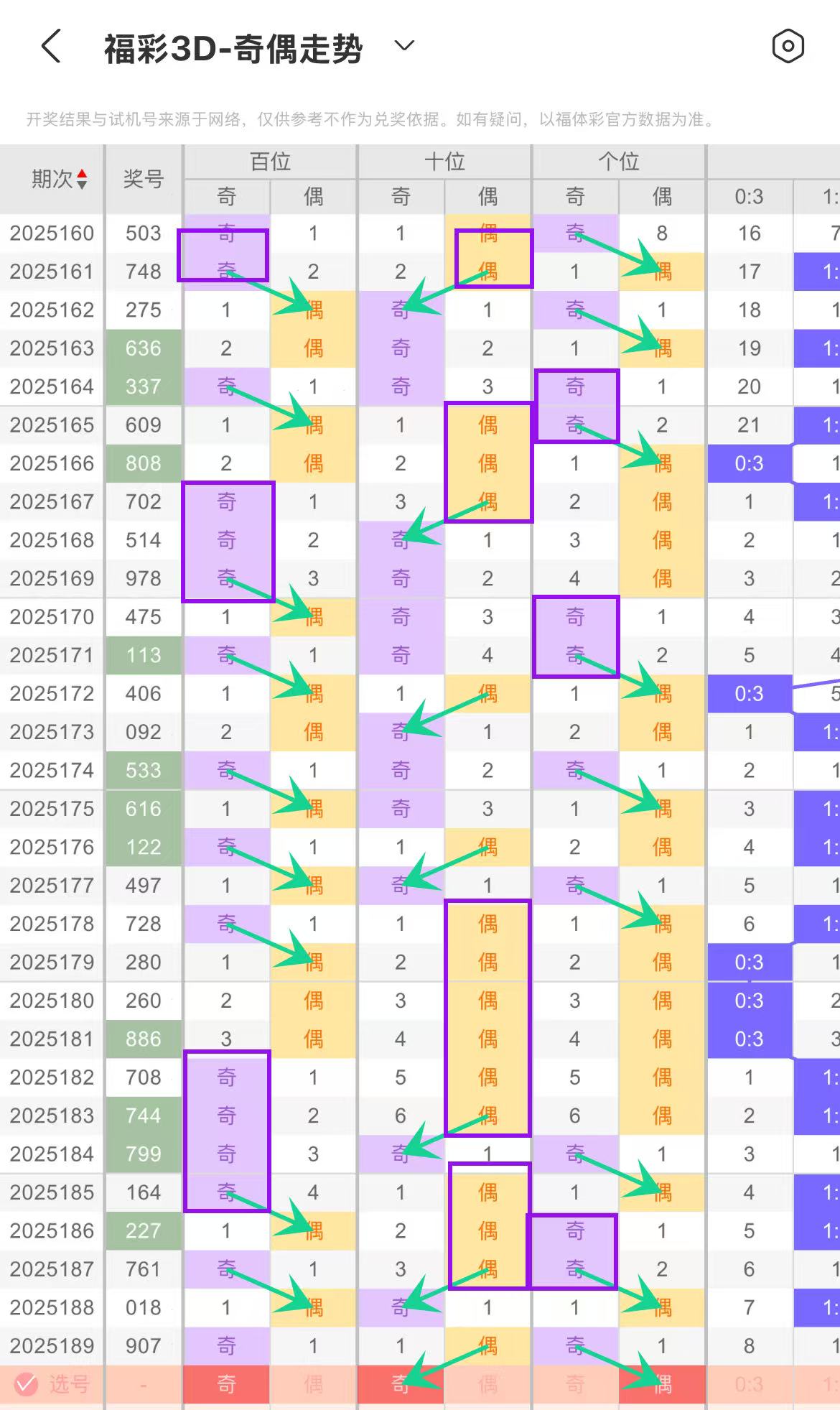 根据上期开出回补奇数分析,百位奇偶呈现明显的交替特征,连下形态让奇数或偶数短期占据主导,展现阶段性强势;回补则打破单一奇偶的持续统治,维持动态平衡。观察可知,连下周期多为2-3期,连下后回补概率高,且回补力度与连下强度相关,连下越久、表现越突出,回补越容易出现,本期参考奇数连下(13579)
