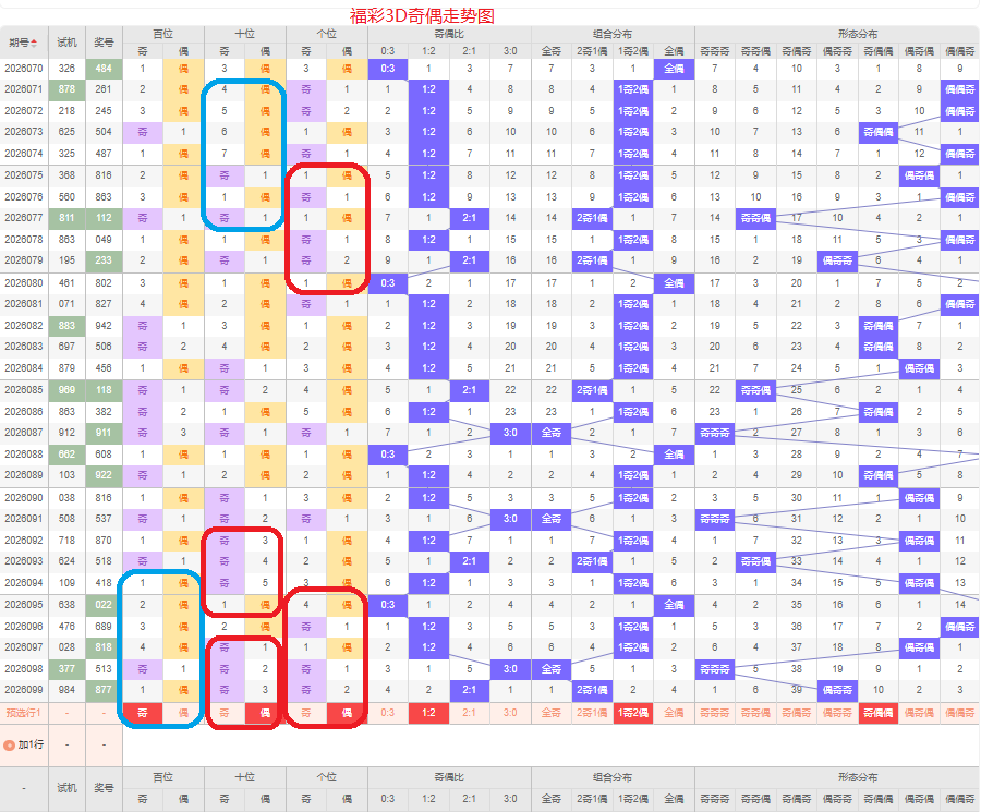 上期奇偶比是2:1,两奇的号码组合方式,从近五期的奇偶数出现情况看,奇数出现7次,偶数出现8次,奇数偶数号码出现较平均,本期侧重两偶的号码组合,侧重奇偶偶或奇偶奇的号码组合方式,根据奇偶形态做五码定位13579/02468/02468或13579/02468/13579