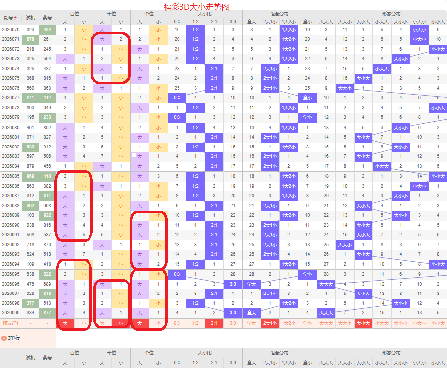 上期大小比为3:0,全大的号码组合方式,从近五期出现情况看,大号码出现9次,小号码出现6次,大号码出现较多,本期侧重两大的号码组合,本期百位侧重大号码,十位侧重小号码,个位要侧重看大,侧重大小大或者大小小的号码组合,根据大小做五码定位56789/56789/01234或56789/01234/01234