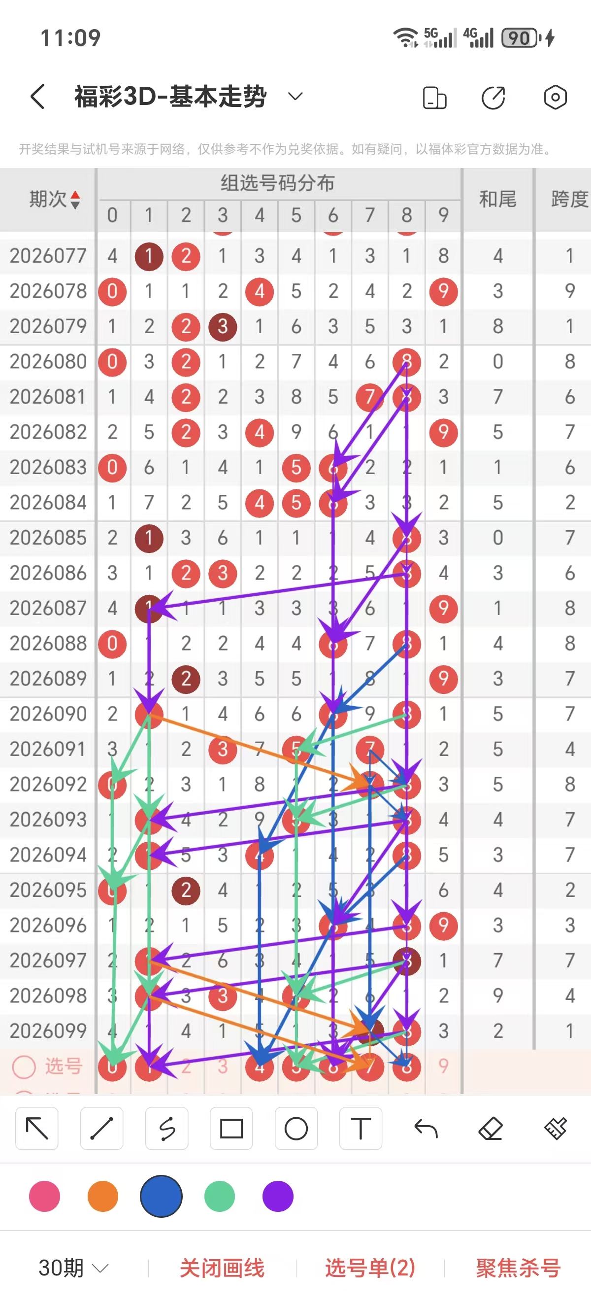 跨度通常情况下在五期之内重复一个跨度的概率很高,近五期没有重复的跨度,近五期跨度为2/3/7/4/1,近期1路的跨度较热,上期是1路的跨度,本期要侧重跨度以4/5/6跨为主的号码组合。可以从跨度方面选择相应的双胆码组合,双胆码的选取要根据近期和历史的走势进一步的分析选取。