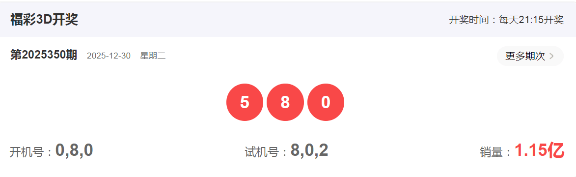 福彩3D2025年12月30日第350期开奖号码是580,和值13,跨度8,奇偶偶,大大小,组六形态