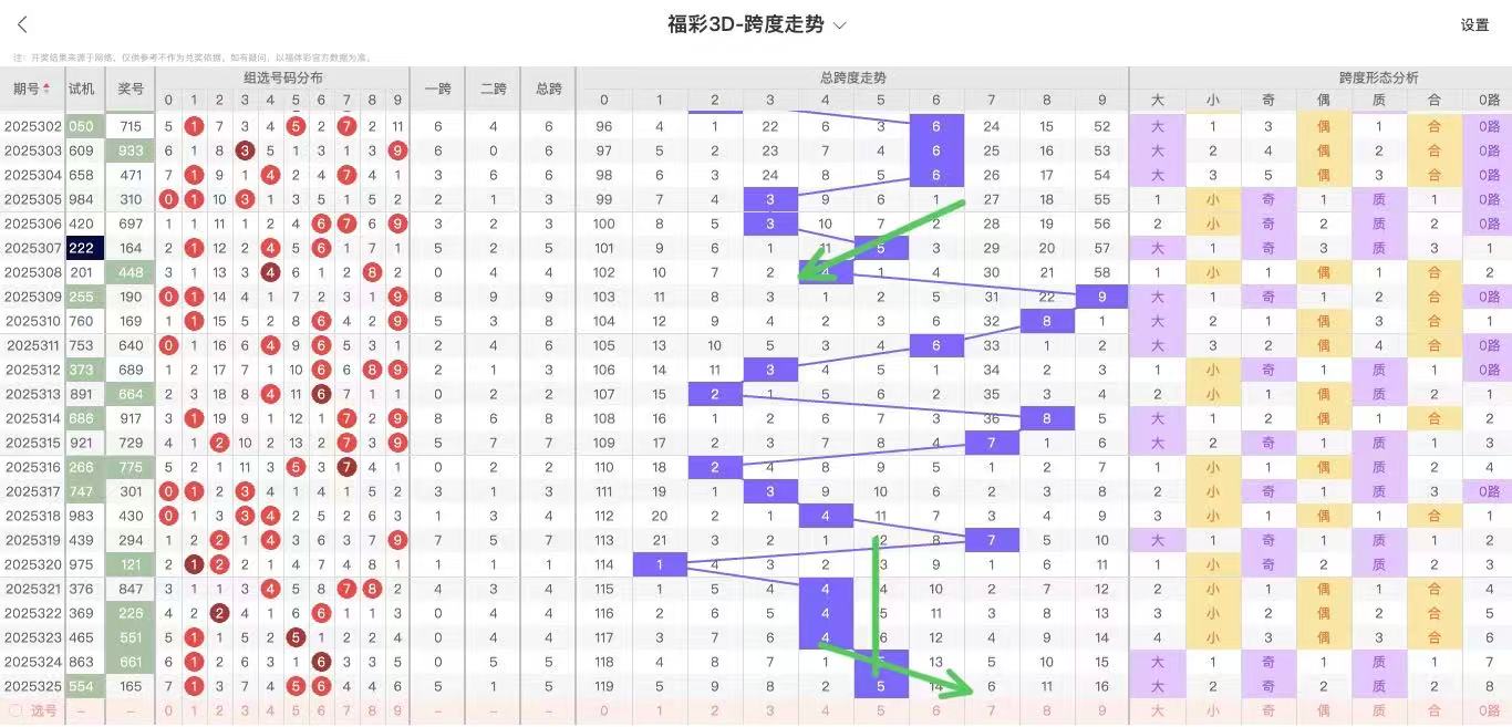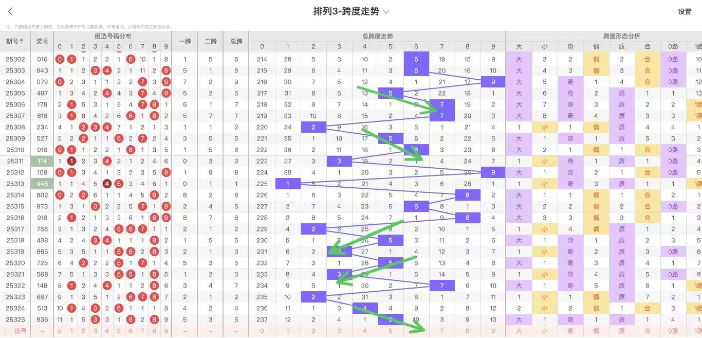 10期内跨度走势为:8-2-5-3-5-3-7-2-4-5,10期内大小跨比:5:5,奇偶跨比6:4,百期内跨度5共开出的20次,下期数据:2 6 7 2 8 3 7 4 9 8 3 4 3 2 6 7 6 3 3 近期度较热,考虑跨度5开出后容易出小跨度,近期大小规律下大:偶:合,所以接下来继续大跨,偶跨度表现!