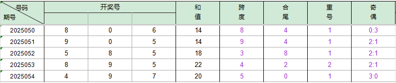 2025051期开奖号码905,我们可以看出近30期百位9出现3次,十位0出现7次,个位5出现3次。