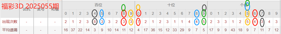 2025053期开奖号码895,我们可以看出近30期百位8出现3次,十位9出现4次,个位5出现5次。