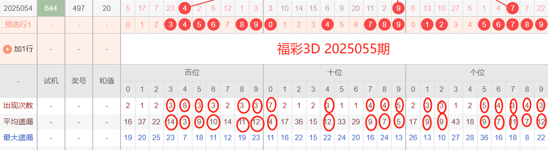 2025054期开奖号码497,我们可以看出近30期百位4出现8次,十位9出现5次,个位7出现3次。