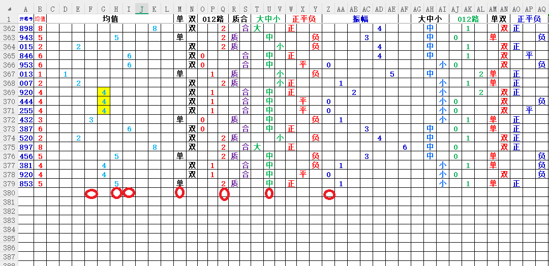 均值:就是开奖号每各数的总和除3,然后得到的余数,如果不够整除可以+1,-1,直到被整除得的数就是均值