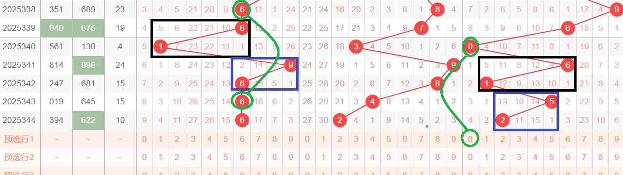 这张走势分析图才刚开始,大家近期可以关注一下,在百位开出了一个黑颜色框6和1,在十位也开出了黑颜色框6和1,在百位开出了蓝颜色9和6,9和6相差等于3,9和6是由大到小的排列方式,在个位也同样开出蓝颜色框5和2,也是两码差3,5和2也是由大到小的排列方式,因为这个走势图才开始走,不知道后面以什么样的方式走,大家看一下就行