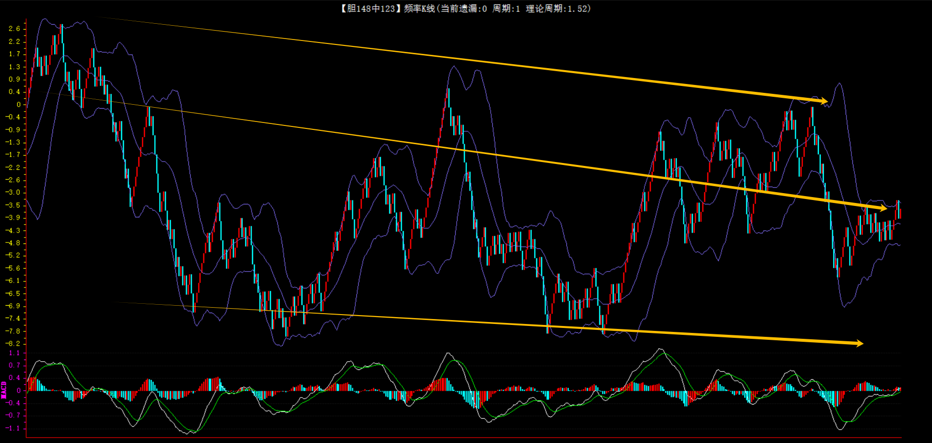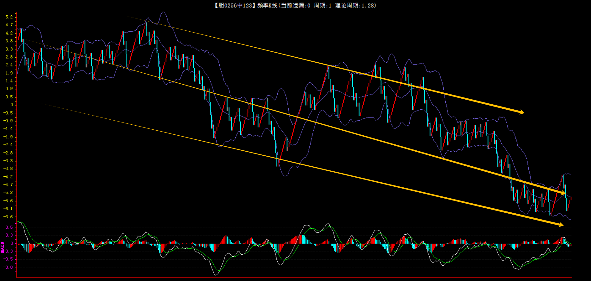 整体趋势下行,上边沿线趋势向下,下边沿趋势也是向下,节点震荡,当前开1期,本期防守。