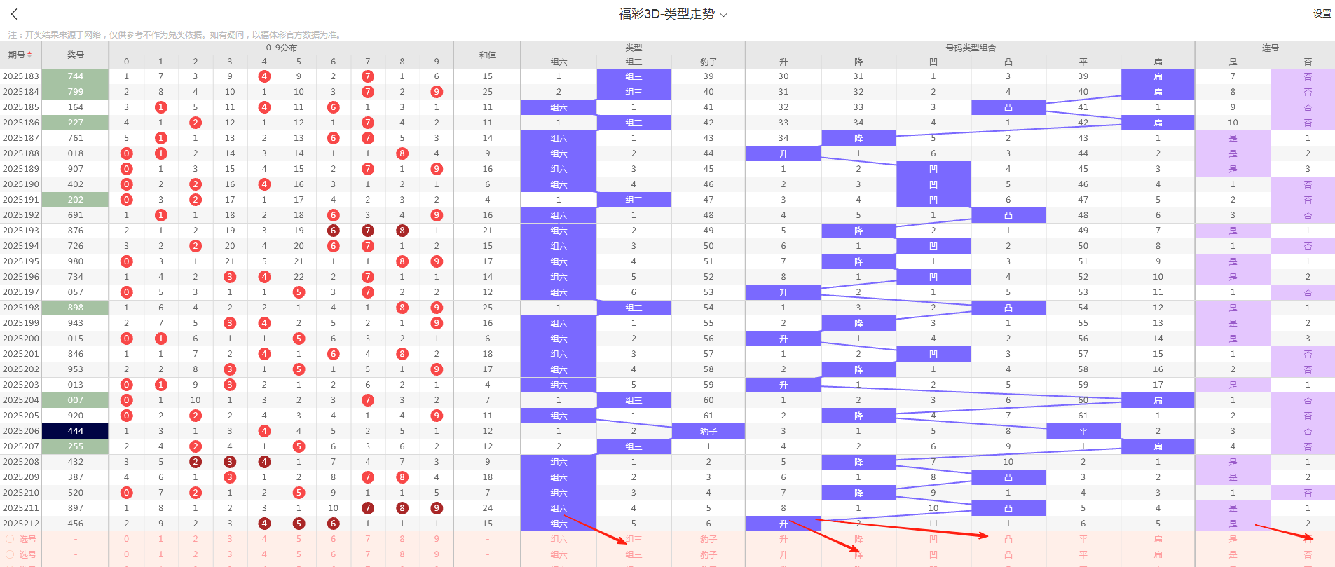 今天福彩3D第2025213期的趋势判断为:方向主看组六防组三;跨度反弹大跨度明显;和值回落中区概率较大;